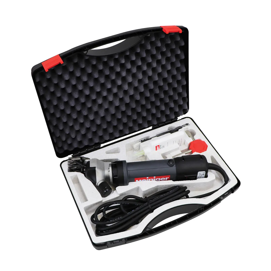 Esta esquiladora potente está dotada de un sistema de muelle flotante. Por consiguiente, se necesita menos presión y el desgaste de las cuchillas está reducido en casi un 50%. Entregado en un maletín resistente y práctico, incluyendo peines, destornillador, aceite y pincel de limpieza. Es una esquiladora sólida y robusta, que cuenta con un sistema de esquila patentado. Además cuenta con una protección térmica de sobrecarga.