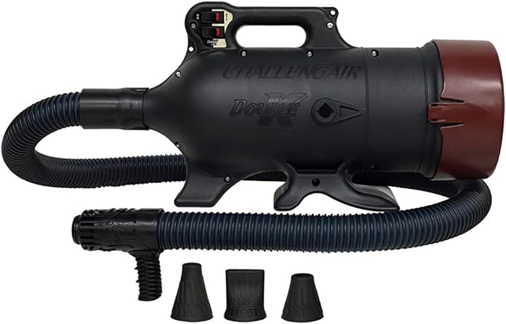 Soplador AIRMAX de 2 motores potentes que optimizan el tiempo mientras que el aire de alta velocidad penetra en las capas más gruesas Su carcasa de alto impacto y la filtración del aire protegen ambos motores, cuenta con aislamiento de silicona moldeada haciendo que el sonido del motor sea bajo con resultados excepcionales. La reducción de la resistencia del aire a través del pasaje por la manguera aumenta el volumen de aire y la velocidad. Las boquillas roscadas a la manguera y la calidad de las mismas evitan la quebraduras que pueden ocurrir en otro tipo de sopladores de aire forzado. Este soplador expulsa el agua del manto con eficacia, rapidez y seguridad. Su uso es ideal para una veterinaria, peluqueria canina y/o un show. Tiene 1 ano de garantía.