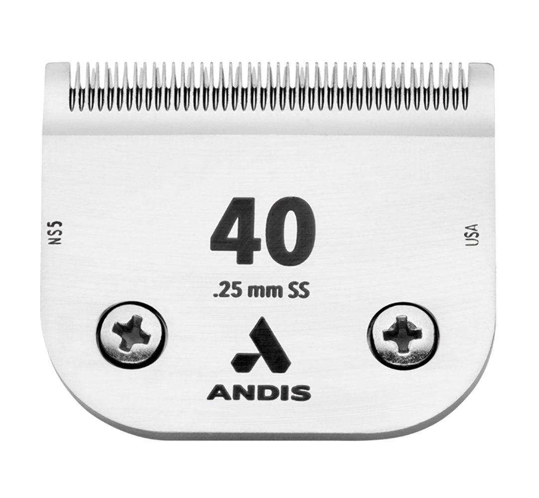 Juego de hojas en acero inoxidable con borde de carbono que prolonga la vida util del filo y lo hace resistente al óxido. Cuenta con el cortante en cerámica, de esta forma permanece por más tiempo el afilado del peine. La profundidad del corte de la cuchilla Andis 40SS es de 0,25 mm.