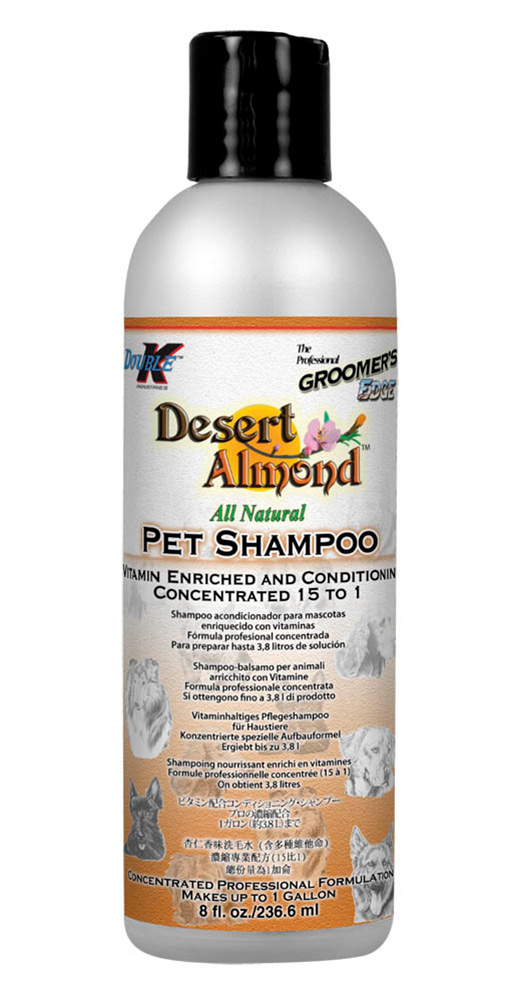 El shampoo Desert Almond de 8oz. es la elección perfecta para una suave limpieza a fondo. Se enjuaga fácilmente y deja el cabello suave y brillante. Contiene desodorantes especiales que eliminan los olores, dejando la capa de pelo con el fresco aroma de las almendras. Tiene un pH balanceado y enriquedico con pantenol, aloe vera y vitaminas A, D, E. Es ideal para utilizarlo en perros, gatos y todos los animales de compania o de granja. Su concentración es 15 a 1.