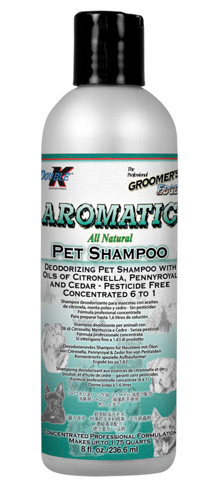 El shampoo Aromatic de 8oz . es orgánico y libre de pesticidas. Es ideal para problemas de la piel sobre todo en el verano. Contiene una duerte y poderoza mezcla de ingredientes botánicos, incluyendo citronella, poleo, eucalipto y aceite de madera de cedro. Tiene una fragancia única que elimina los olores, incluso olores fuertes como el de zorrillo. Es ideal para el uso en perros y gatos. Su concentración es 6 a 1.